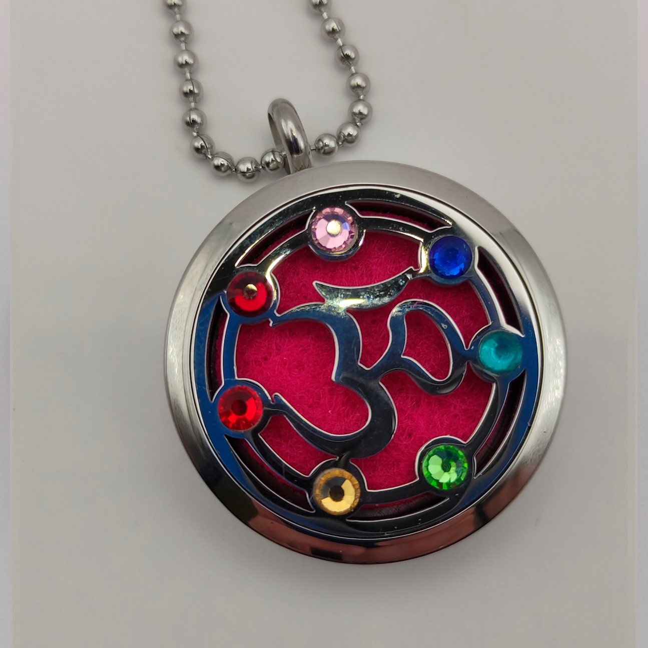 Las piedras coloridas alrededor del símbolo Om añaden un elemento decorativo y simbólico, representando los chakras y haciendo de este collar una herramienta para el equilibrio energético.